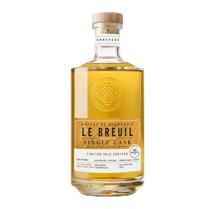 On retrouve en bouche une structure soyeuse, marquée par des notes de fruits secs, de noisette, de cuir et de vin oxydatif, typiques du Palo Cortado, mais équilibrées par la douceur céréalière du malt normand. Chaque bouteille provient du fût unique n°23044.