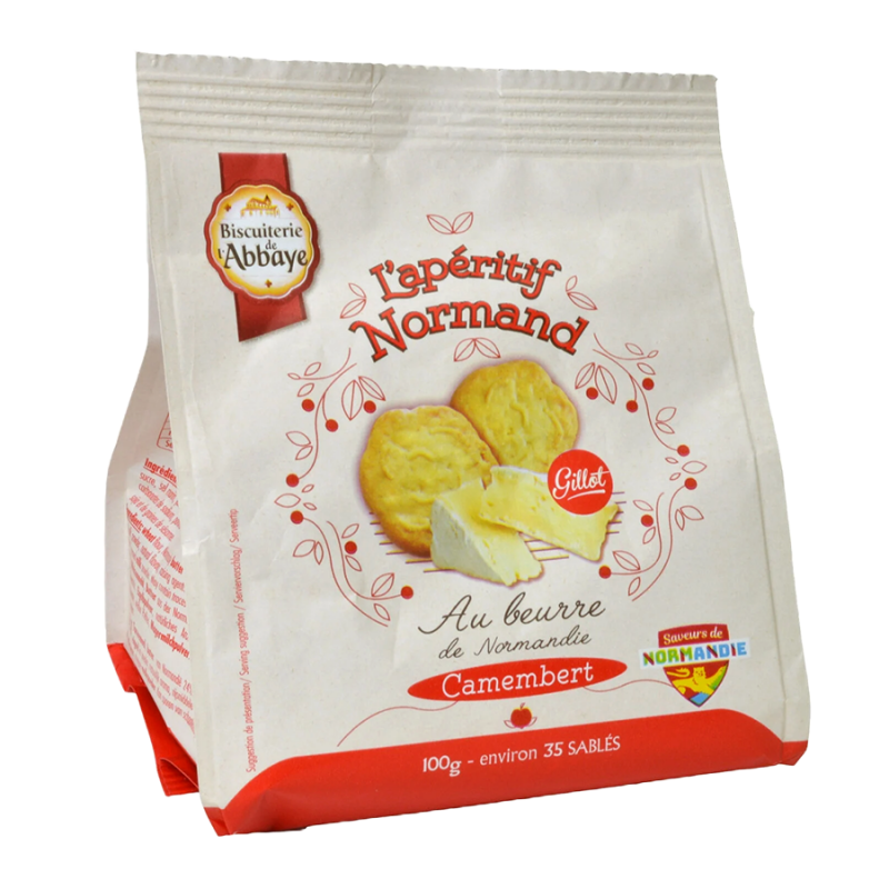 Des petits sablés salés pur beurre au Beurre d’Isigny AOP et au Camembert fabriqué en Normandie. Croustillants, pas trop salés, avec une vraie note fromagère, le genre de sachet qui disparaît vite à l’apéro !
