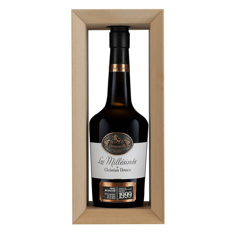Calvados millésimé de 1999 en AOC Pays d'Auge du domaine Christian Drouin. Présenté dans une caisse bois. L'année du millésime correspond à l'année de distillation.