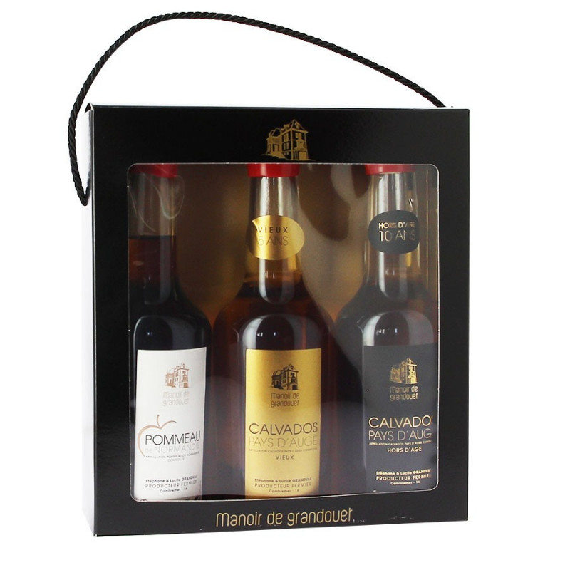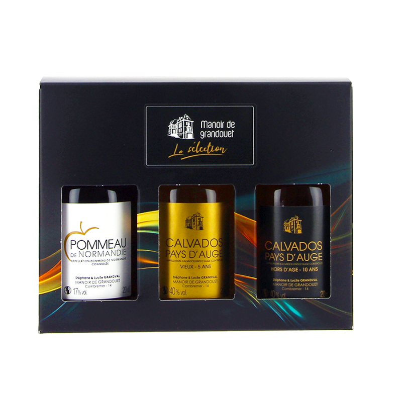 Partez à la découverte des produits du Manoir de Grandouet. Dans ce coffret en carton vous retrouverez une bouteille de Pommeau de Normandie AOC de 20cl ainsi que deux bouteilles de Calvados Pays d'Auge AOC de 20cl. La différence entre les deux Calvados est le temps de vieillissement. Le vieux a un vieillissement de 5 ans alors que le Hors d'âge a une durée de 10ans.
