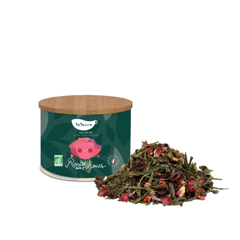 Rouge aux Joues, c'est la tasse qui fait sourire dès qu'on la tient entre les mains. Ce thé vert bio en vrac signé Tatasse réunit la fraise, la framboise et une touche de crème dans une composition d'une générosité remarquable, aussi douce à regarder qu'à savourer.